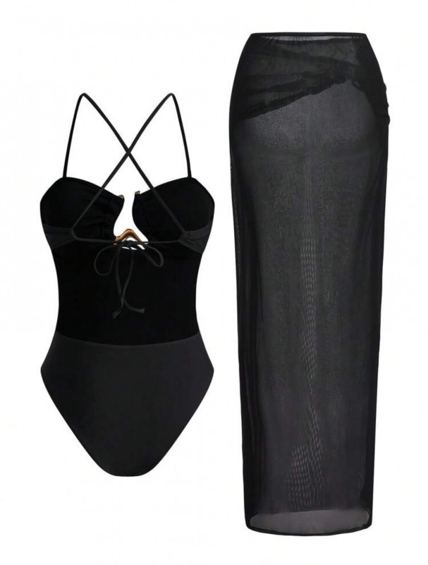 Blue Color Neck Bikini Mesh Skirt 3pcs Swimwear