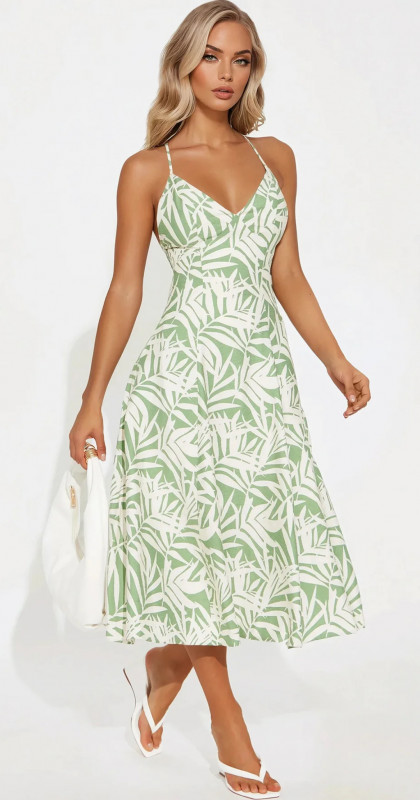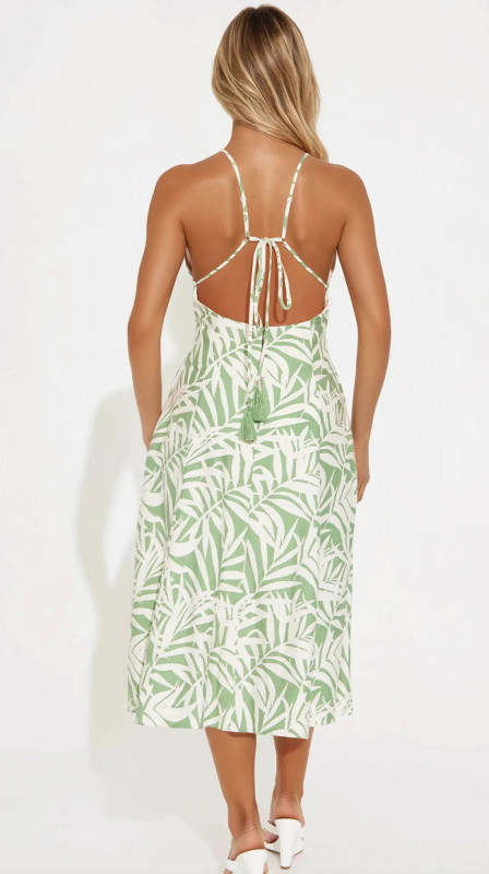 Tropical Feeling Linen Midi Dress - Sage/combo